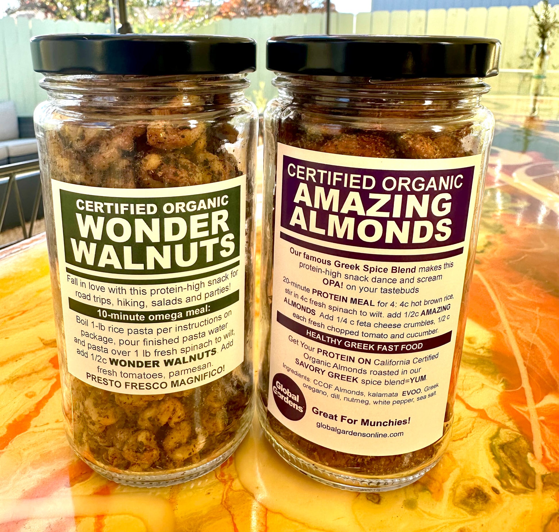 One 12 oz jar each Amazing Almonds and Wonder Walnuts. Here are a couple of products you vegans and vegetarians will want to live on for salads, pastas (yes pastas!) and protein snacking!